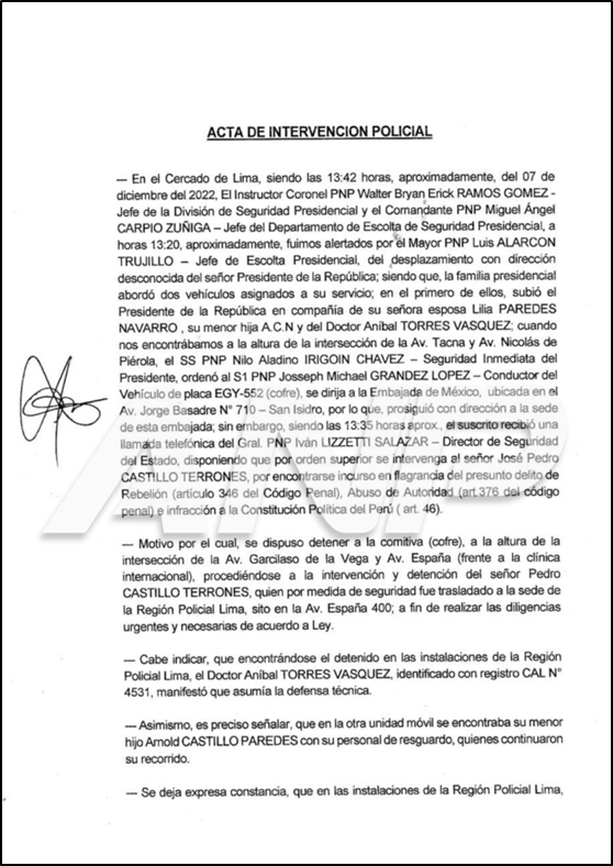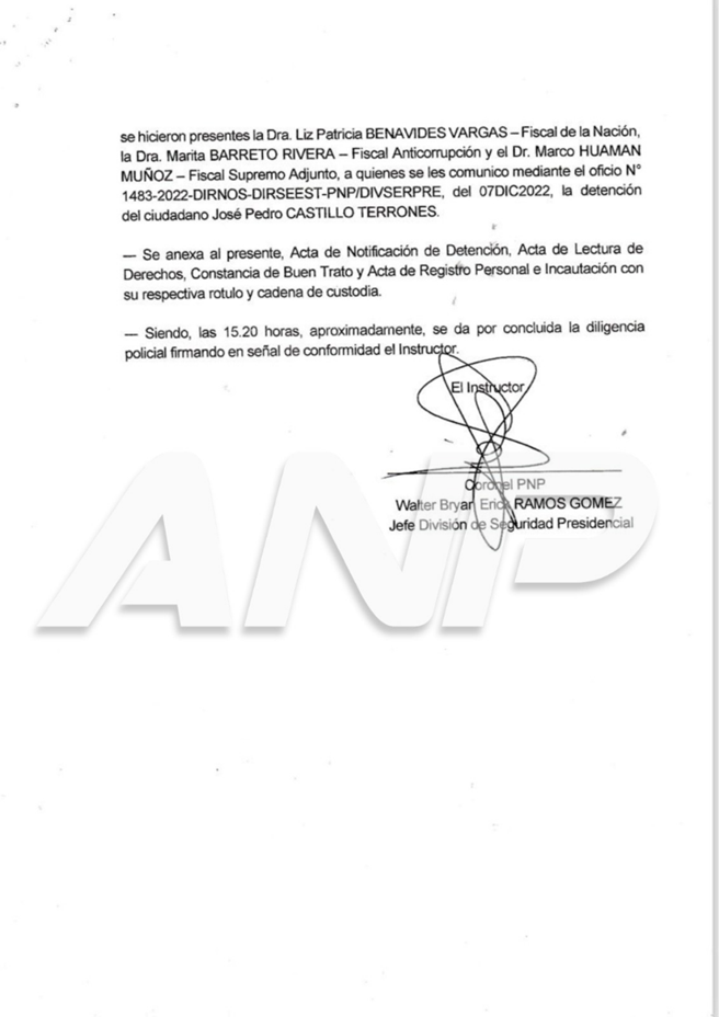 Según el documento, el coronel PNP Walter Bryan Erick Ramos Gómez, jefe de la División de Seguridad Presidencial, recibió a las 13:35 horas de aquel 7 de diciembre de 2022 una llamada telefónica del general PNP Iván Lizzetti, quien dispuso intervenir de inmediato a Castillo Terrones. Lizzetti afirmó que la disposición venía “por orden superior”; es decir, el Gral. PNP Vicente Álvarez.