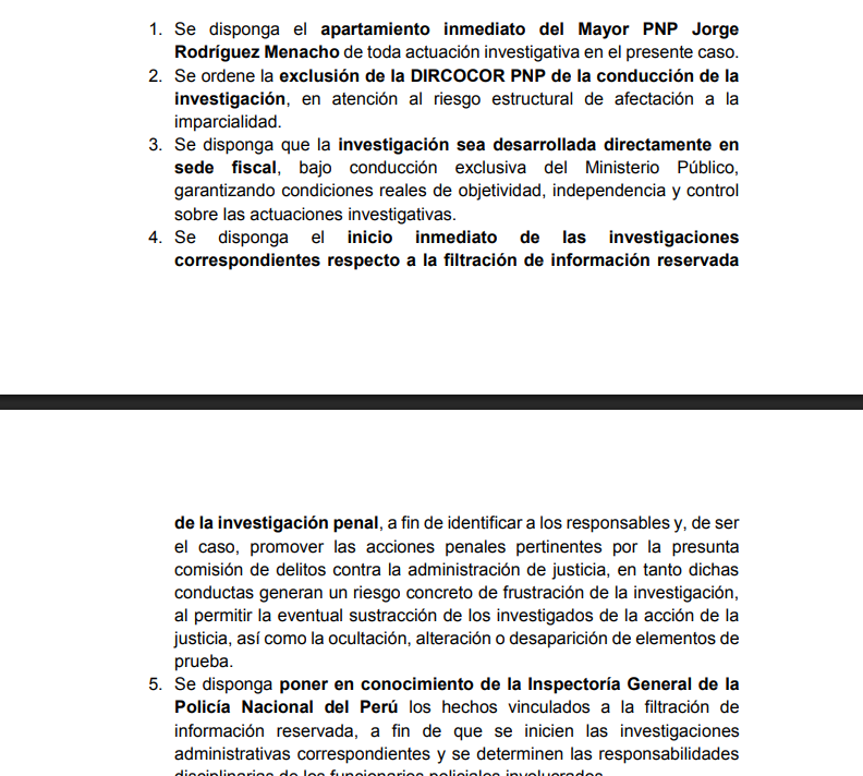 “Se disponga el apartamiento inmediato del Mayor PNP Jorge Rodríguez Menacho de toda actuación investigativa en el presente caso. Se ordene la exclusión de la DIRCOCOR PNP de la conducción de la investigación, en atención al riesgo estructural de afectación a la imparcialidad.Se disponga que la investigación sea desarrollada directamente en sede fiscal, bajo conducción exclusiva del Ministerio Público, garantizando condiciones reales de objetividad, independencia y control sobre las actuaciones investigativas”, se lee en la primera parte del documento.