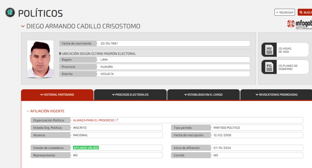 Asimismo, según el registro de Infogob, el burgomaestre de Medio Mundo se encuentra afiliado al partido político de Alianza para el Progreso desde octubre de 2024.