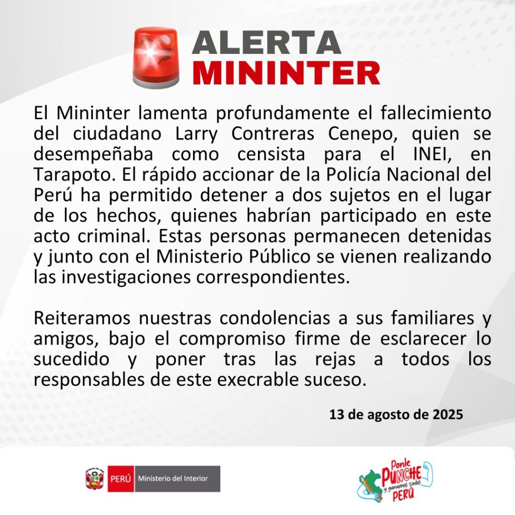 Mediante un comunicado, el Ministerio del Interior lamentó el fallecimiento del censista del INEI, Larry Contreras Cenepo, quien lamentablemente fue encontrado sin vida en su vivienda. Asimsimo, informaron que efectivos de la Policía Nacional del Perú pudieron detener a los presuntos sospechosos del crimen.
