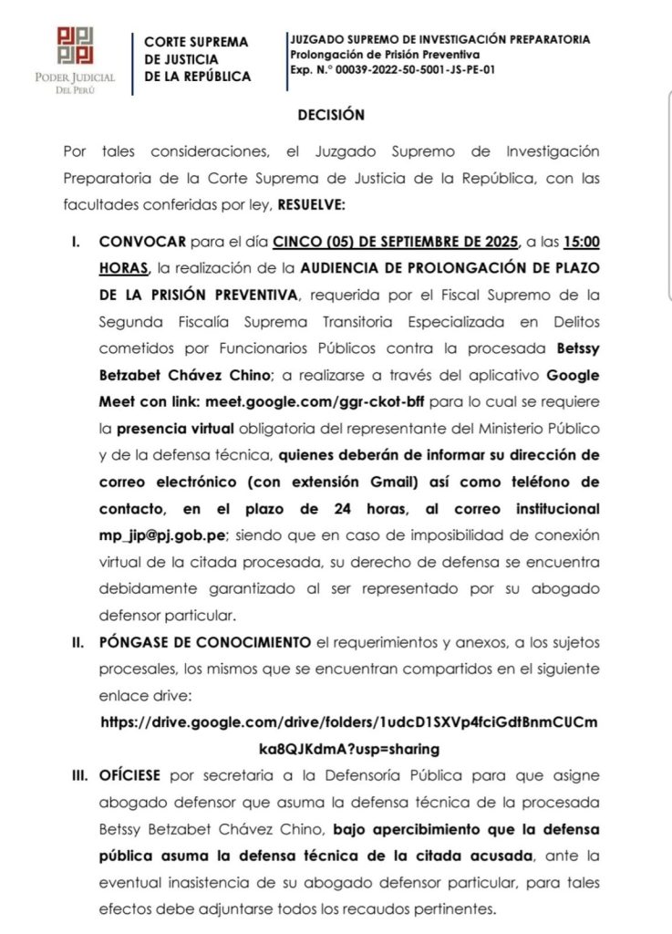 El Juzgado Supremo de Investigación Preparatoria ha precisado que la audiencia se realizará vía Google Meet. En caso de que el abogado de Chávez no se conecte, se designará un defensor público para garantizar su derecho a la defensa técnica.