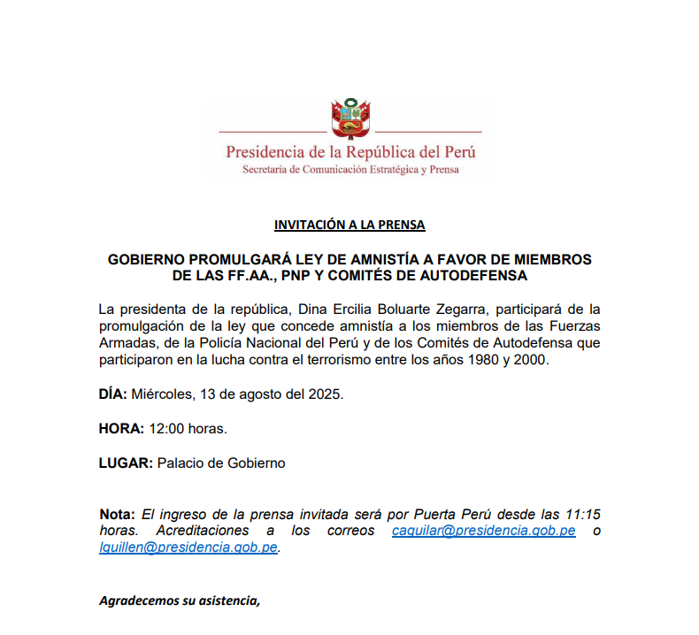 Este miércoles 13 de agosto, se conoció que la presidenta de la República, Dina Boluarte participará en la promulgación de la Ley que concede amnistía a los miembros de las Fuerzas Armadas y de la Policia Nacional del Perú en la lucha contra el terrorismo entre los años 1980 y 2000.