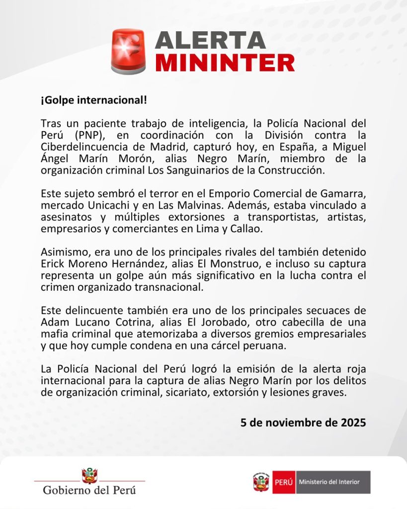 El Ministerio del Interior (Mininter) informó que la captura se concretó tras una alerta roja emitida por la Interpol, en la que se le acusa de sicariato, extorsión, organización criminal y lesiones graves. Marín es considerado una figura clave dentro de la red “Los Sanguinarios de la Construcción”, grupo delictivo responsable de múltiples actos violentos y extorsivos en Lima Norte.