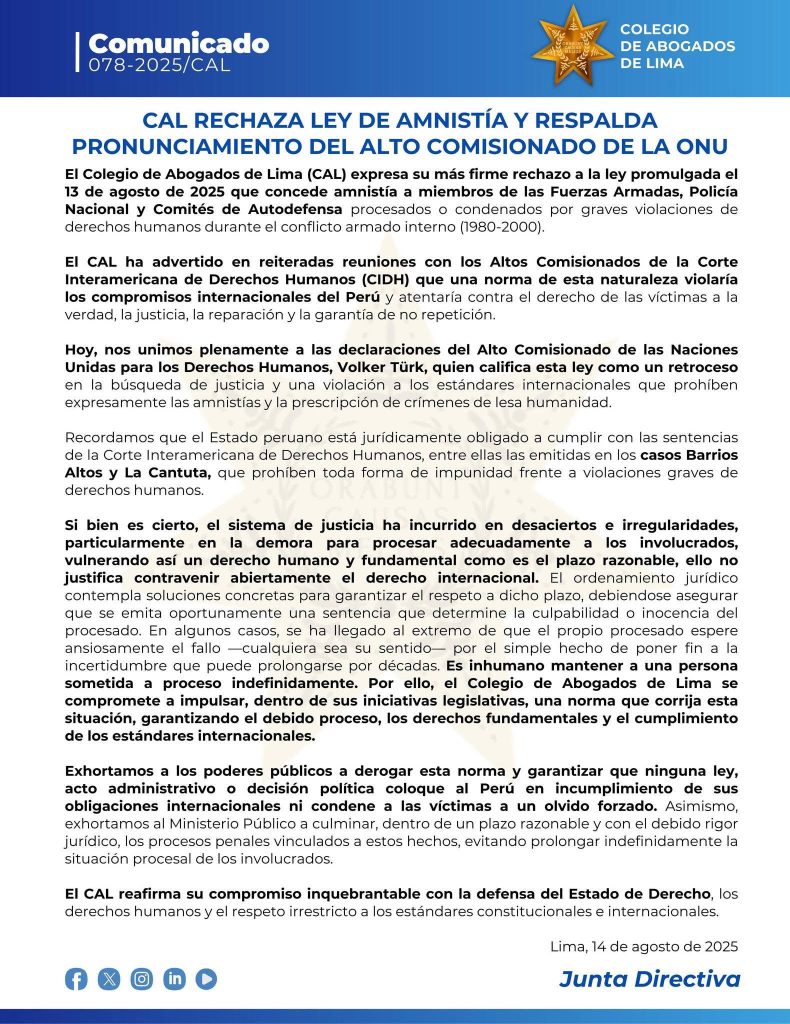 El CAL respaldó las declaraciones del Alto Comisionado de las Naciones Unidas para los Derechos Humanos, Volker Türk, quien calificó la medida como “un retroceso en la búsqueda de justicia y una violación de los estándares internacionales que prohíben expresamente las amnistías y la prescripción de crímenes de lesa humanidad”.