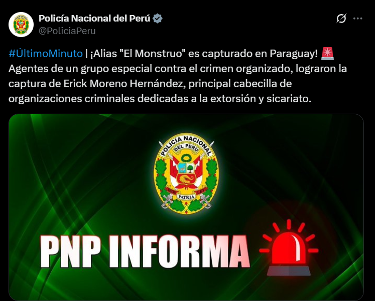 La Policía Nacional del Perú celebró la captura con un mensaje contundente en sus redes sociales: