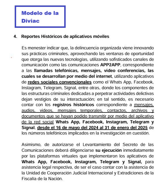 “Hoy las organizaciones criminales ya no coordinan por llamadas convencionales, sino por WhatsApp, Telegram o Signal. Si realmente existe la voluntad de desenmascar la corrupción del gobierno anterior, corresponde solicitar también el historial de mensajes, audios, llamadas VoIP, documentos y multimedia de estas plataformas”, comentó el ahora coronel en situación en retiro de la Policía Nacional del Perú.