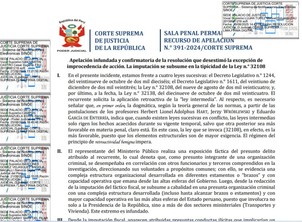 El recurso de apelación analizado por la Corte Suprema plantea un problema jurídico complejo en torno a la aplicación retroctiva de leyes penales sucesivas, en particular, la Ley n.° 32108, y su incidencia en la tipicidad del delito de organización criminal. La defensa de Geiner Alvarado López, exministro de Vivienda, Construcción y Saneamiento, sostenía la atipicidad de los hechos imputados ante la modificación normativa, alegando la ausencia de los elementos estructurales y teleológicos introducidos por dicha ley.
