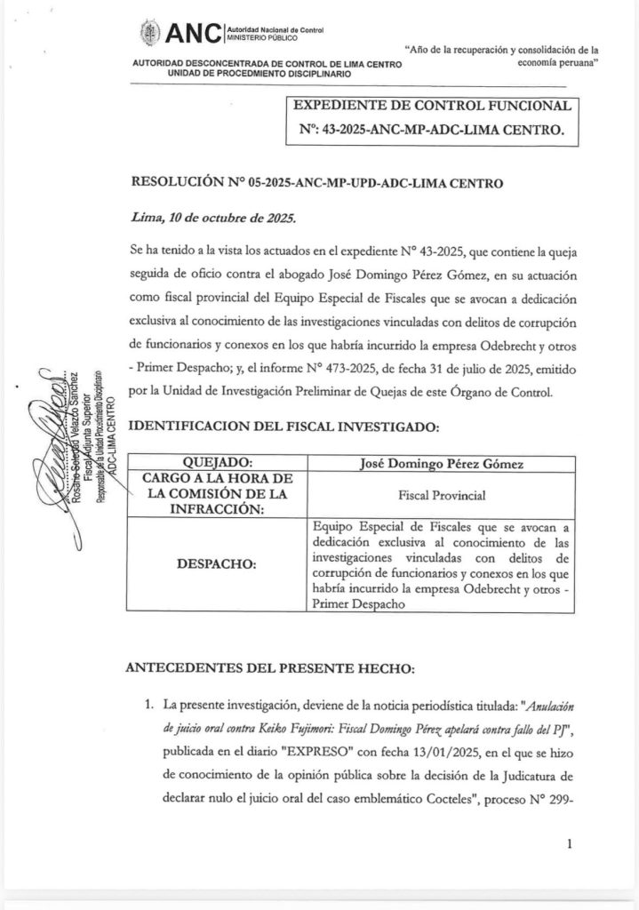 Según la resolución administrativa, el procedimiento disciplinario se relaciona con la apelación interpuesta por Pérez tras la nulidad de la acusación fiscal en el caso Cócteles, decisión que fue posteriormente revertida por el Tribunal Constitucional (TC) al declarar fundada la demanda de habeas corpus presentada por la defensa de Keiko Fujimori.