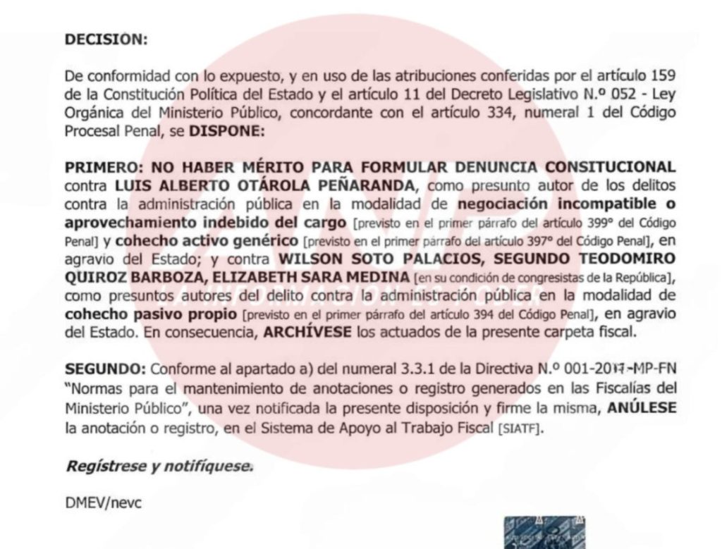 “No haber mérito para formular denuncia constitucional contra Luis Alberto Otárola Peñaranda, como presunto autor de los delitos contra la administración pública en la modalidad de negociación incompatible o aprovechamiento indebido del cargo y cohecho activo genérico agravio del Estado; y contra Wilson Soto Palacios, Segundo Teodomiro Quiroz Barboza, Elizabeth Sara Medina como presuntos autores del delito contra la administración pública en la modalidad de cohecho pasivo propio, en agravio del Estado. En consecuencia. archívase los actuados de la presente carpeta fiscal”, se lee en el documento.