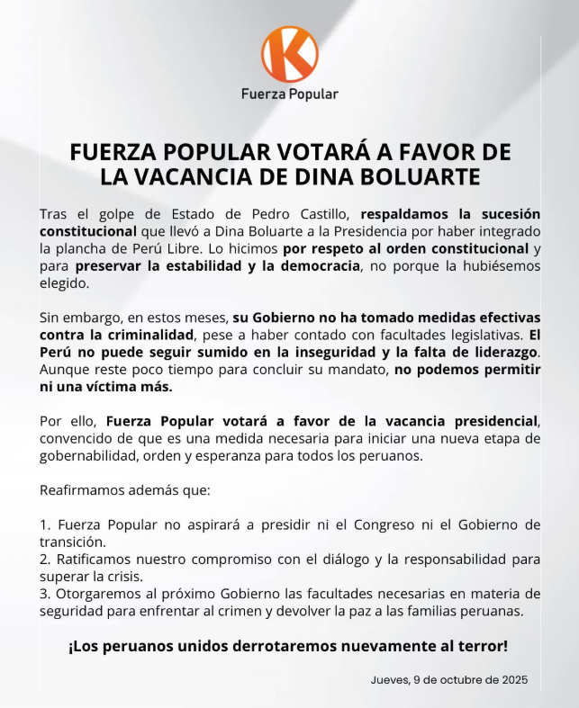 El pronunciamiento del fujimorismo, difundido en el marco del debate por la vacancia presidencial, resaltaba su respaldo a la sucesión constitucional tras la destitución de Pedro Castillo, pero criticaba la gestión de Dina Boluarte por su incapacidad para enfrentar la inseguridad ciudadana.