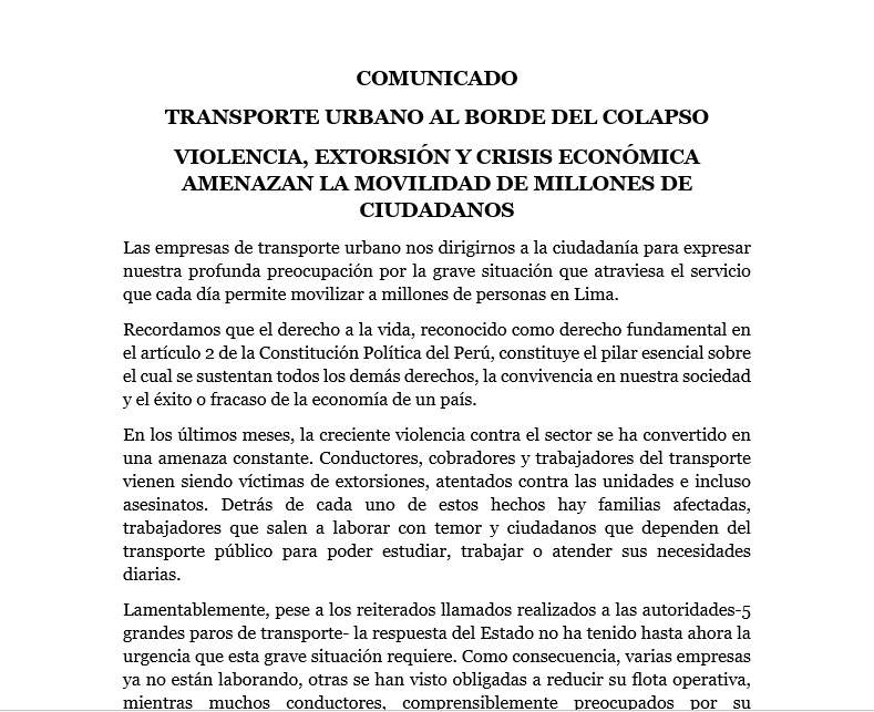 Uno de los principales problemas señalados por los gremios es el incremento de la violencia contra los trabajadores del sector. Según el comunicado, conductores, cobradores y otros trabajadores del transporte vienen siendo víctimas de extorsiones, amenazas y ataques contra las unidades de transporte.