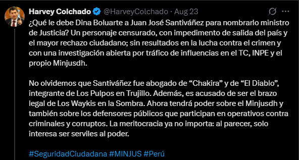 “¿Qué le debe Dina Boluarte a Juan José Santiváñez para nombrarlo ministro de Justicia? Un personaje censurado, con impedimento de salida del país y el mayor rechazo ciudadano; sin resultados en la lucha contra el crimen y con una investigación abierta por tráfico de influencias en el TC, INPE y el propio Minjusdh”, señaló Colchado.