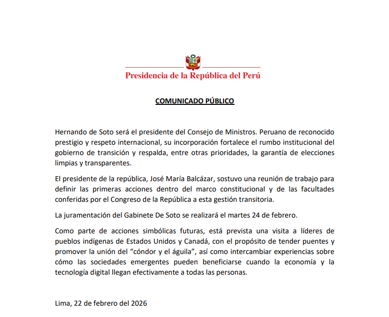 El economista y excandidato presidencial Hernando de Soto Polar fue designado como nuevo presidente del Consejo de Ministros del gobierno de José Balcázar, según confirmó la Presidencia mediante un comunicado oficial. La juramentación está programada para el próximo martes 24 de febrero, marcando un cambio clave en el equipo político del Ejecutivo.