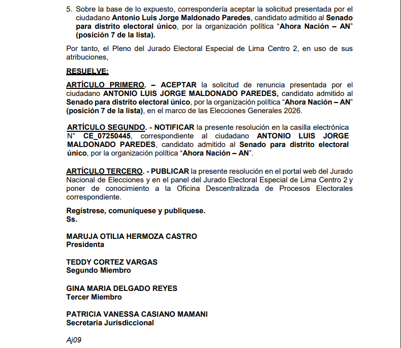 “Aceptar la solicitud de renuncia presentada por el ciudadano Antonio Luis Jorge Maldonado Paredes, candidato admitido al Senado para distrito electoral único, por la organización política “Ahora Nación – AN”