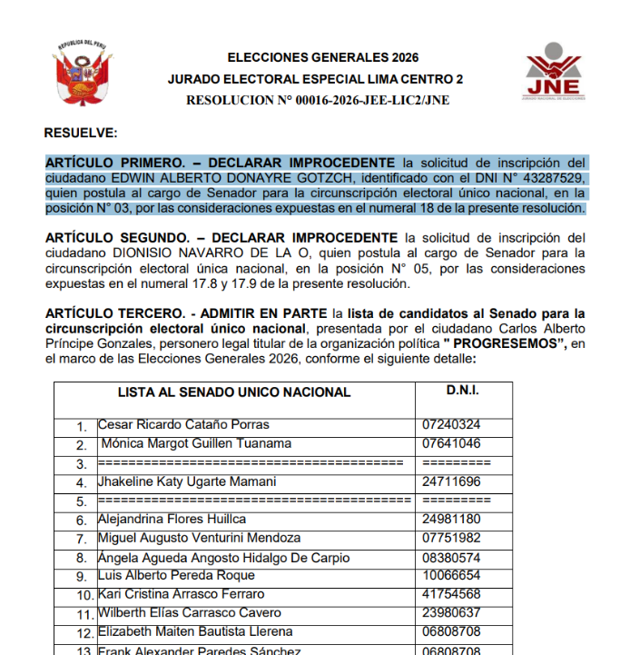 “Declarar improcedente la solicitud de inscripción del ciudadano Edwin Alberto Donayre Gotzch (…) quien postula al cargo de Senador para la circunscripción electoral único nacional, en la posición N°03, por las consideraciones expuestas en el numeral 18 de la presente resolución”, se lee en la resolución del JEE Lima Centro 2.