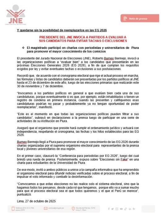 Durante una visita oficial a la región Piura, el titular del JNE recordó que el proceso electoral ya se encuentra en marcha y que las organizaciones políticas tienen hasta el 23 de diciembre de 2025 para presentar ante el jurado sus fórmulas presidenciales y listas congresales. Dicho plazo será posterior a las elecciones primarias internas, programadas para el 30 de noviembre y el 7 de diciembre, donde los militantes definirán a sus representantes oficiales.
