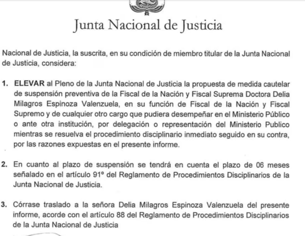De ser aprobada por el pleno de la JNJ, la suspensión de seis meses marcaría un hecho sin precedentes en la historia reciente del Ministerio Público, dejando en entredicho la legitimidad de la conducción de Espinoza y profundizando la crisis en la Fiscalía.