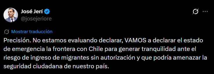 “Vamos a declarar el estado de emergencia en la frontera con Chile para generar tranquilidad ante el riesgo de ingreso de migrantes sin autorización y que podría amenazar la seguridad ciudadana.”