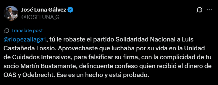 “Rafael López Aliaga, tú le robaste el partido Solidaridad Nacional a Luis Castañeda Lossio. Aprovechaste que luchaba por su vida en la Unidad de Cuidados Intensivos, para falsificar su firma, con la complicidad de tú socio Martín Bustamante, delicuente confeso quien recibió el dinero de OAS y Odebrecht. Eso es un hecho y está probado”, fue el primer twitter del ahora congresista de Podemos Perú.
