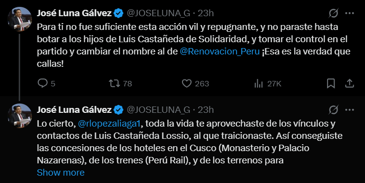 “Para ti no fue suficiente esta acción vil y repugnante, y no paraste hasta botar alos hijos de Luis Castañeda de Solidariad, y tomar el control en el partido y cambiar el nombre al de Renovación Popular ¡Esa es la verdad que callas! (…) Lo cierto, Rafael López Aliaga, toda la vida te aprovechaste de los vínculos y contactos de Luis Castañeda Lossio, al que traicionaste. Así conseguiste las conseciones de los hoteles en el Cusco (Monasterio Y Palacio Nazarenas), de los trenes (Perú Rail), y de los terrenos para cementerios. Esta es la verdad: tú eras el gran lobista que se aprovechó de Castañeda Lossio”, sostuvo Luna Gálvez.