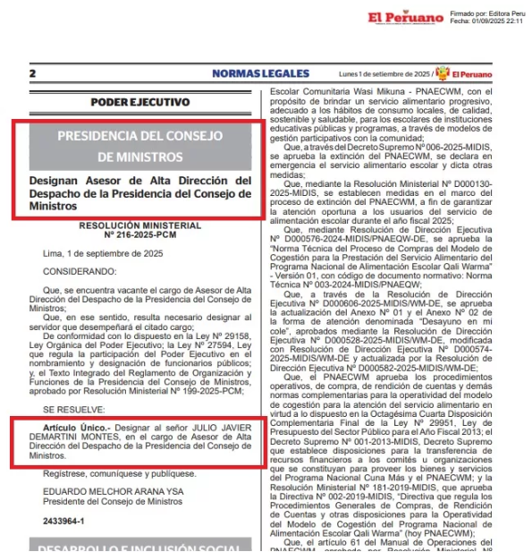 La norma establece de manera clara: “Se resuelve designar al señor Julio Javier Demartini Montes en el cargo de asesor de Alta Dirección del Despacho de la Presidencia del Consejo de Ministros”. Con esta disposición, el exministro vuelve a ocupar un espacio dentro del Gobierno, aunque sobre él aún pesan investigaciones fiscales vinculadas al programa Qali Warma.
