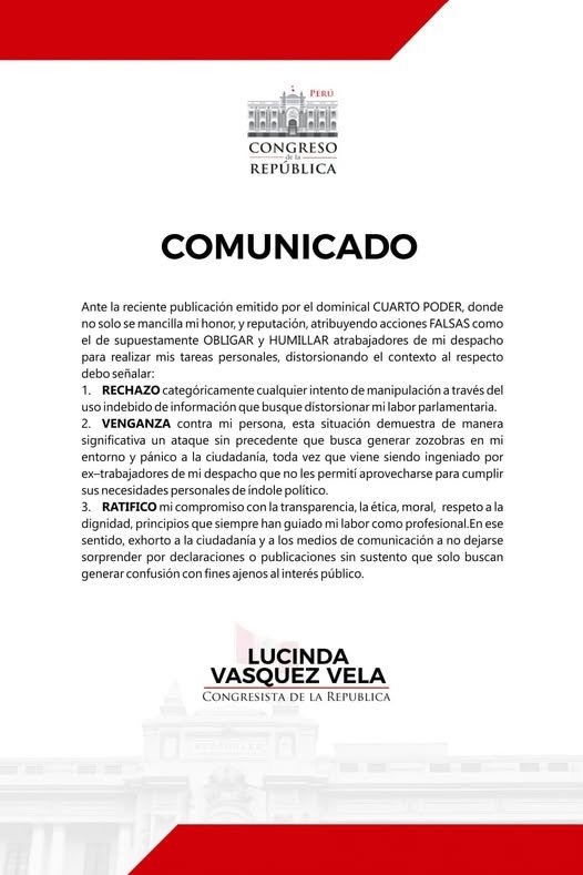 “Estas denuncias son parte de una campaña política y mediática para dañar mi imagen. Nunca he obligado ni he autorizado el uso indebido del personal del Congreso. Mis colaboradores siempre han trabajado con dignidad y compromiso”, expresó la parlamentaria.