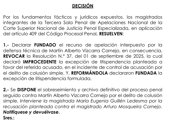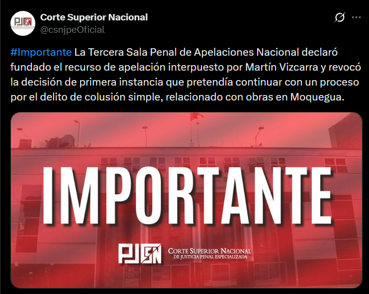 En su resolución, la Tercera Sala Penal de Apelaciones Nacional declaró fundado el recurso presentado por el expresidente y dispuso el sobreseimiento y archivo definitivo del proceso por colusión simple. Con ello, dejó sin efecto la decisión de primera instancia que había considerado viable la continuidad del proceso vinculado a las obras ejecutadas durante la gestión de Vizcarra como gobernador regional de Moquegua.
