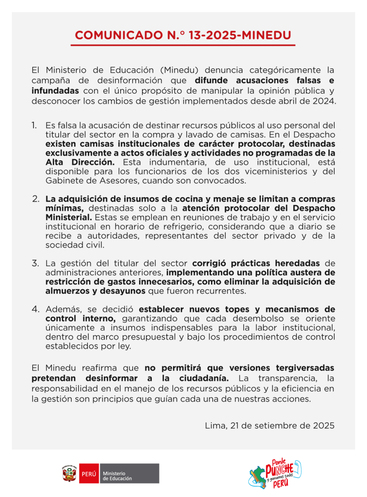 Consultado por Cuarto Poder, el Ministerio de Educación argumentó que las compras de ropa correspondieron a dotación protocolar para actos oficiales, mientras que los insumos alimenticios habrían servido para atender reuniones en el despacho ministerial. No obstante, los comprobantes obtenidos muestran que varias adquisiciones se realizaron directamente para el uso de Quero.