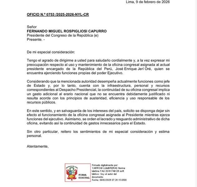 El pedido fue presentado mediante un oficio dirigido al presidente del Congreso, Fernando Rospigliosi (Fuerza Popular), en el que Yarrow plantea dejar sin efecto el funcionamiento de la oficina parlamentaria asignada a Jerí mientras dure su gestión presidencial. Asimismo, solicitó que se disponga el lacrado y resguardo administrativo del despacho, con el fin de evitar la continuidad de costos operativos innecesarios.