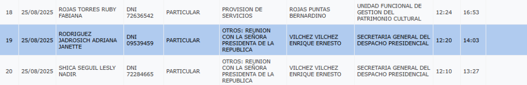 Según el portal de visitas del Despacho Presidencial, Adriana Rodríguez se reunió con Dina Boluarte días antes de su nombramiento como jefa del IRTP. Foto: Transparencia.