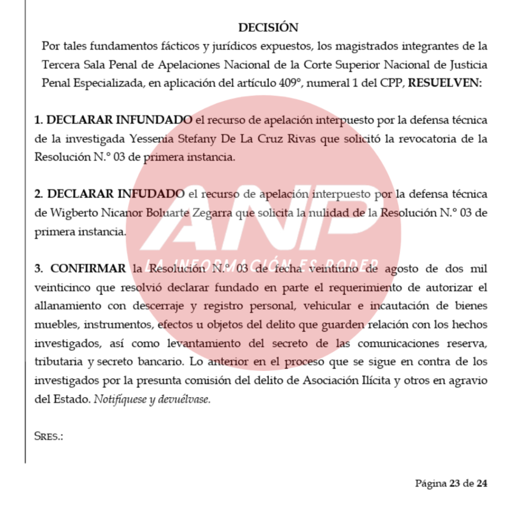 Según el documento judicial, al que tuvo acceso este medio de comunicación, el tribunal determinó que existen elementos de convicción suficientes para mantener las medidas restrictivas tanto en el caso de Nicanor Boluarte como en el de Yessenia De La Cruz, también apelante en el mismo proceso.