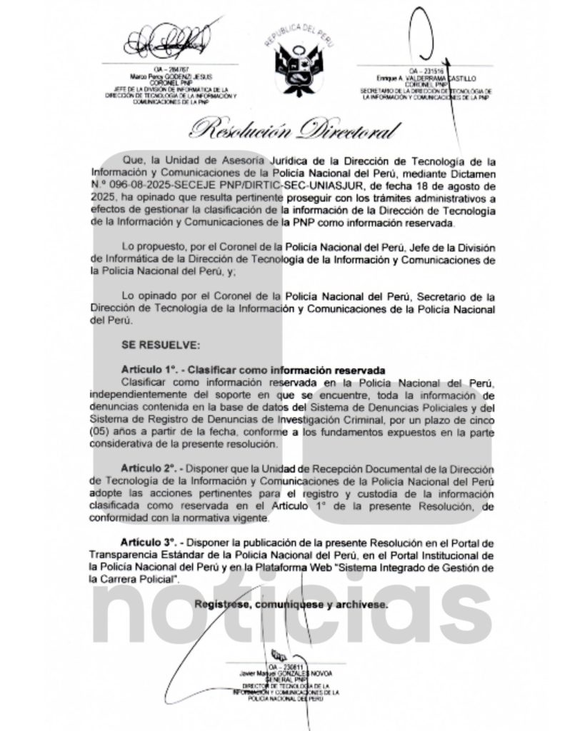 La medida quedó establecida mediante una resolución directoral del 25 de agosto de 2025, firmada por el general Javier Gonzales Novoa, actual director de Tecnología de la Información y Comunicaciones de la PNP. El documento precisa que la decisión aplica a la totalidad de registros que figuran en el Sistema de Denuncias Policiales (SIDPOL) y en el Sistema de Registro de Denuncias de Investigación Criminal (SIDC).