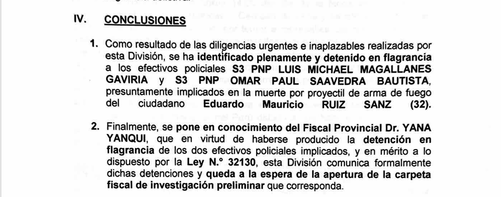 En un documento remitido al fiscal Roger Yana Yanqui, de la Tercera Fiscalía Penal Supraprovincial Especializada en Derechos Humanos e Interculturalidad, se confirmó que los agentes Luis Michael Magallanes Gaviria (28 años) y Omar Raúl Saavedra Bautista (26 años) fueron detenidos por su presunta participación en el uso de armas de fuego durante los hechos.