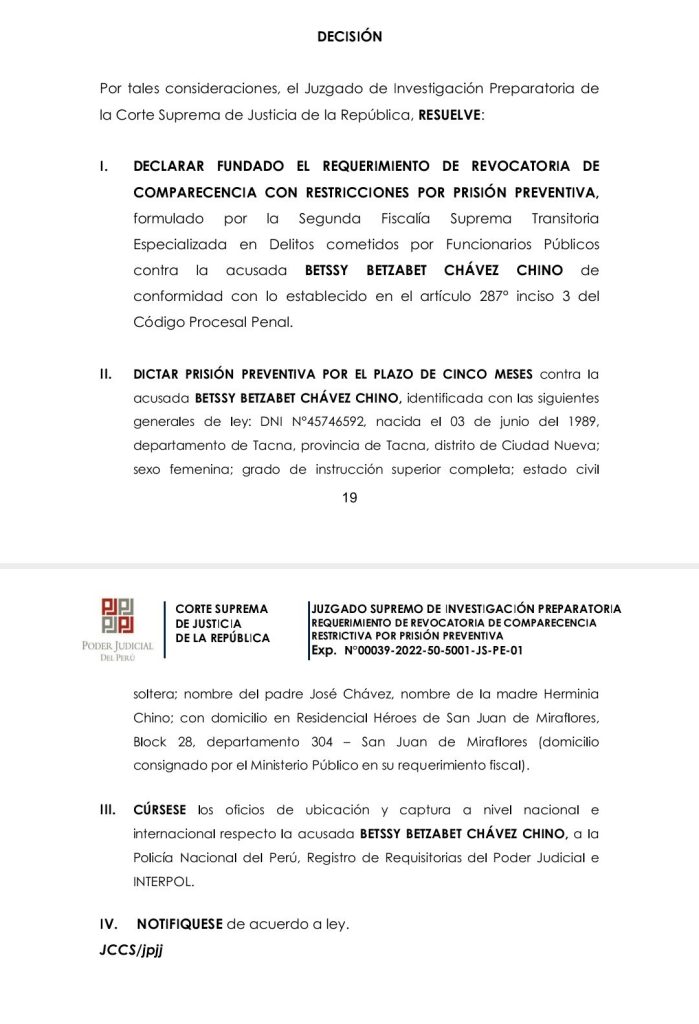 Poder Judicial ordena prisión preventiva para Betssy Chávez y dispone su captura nacional e internacional