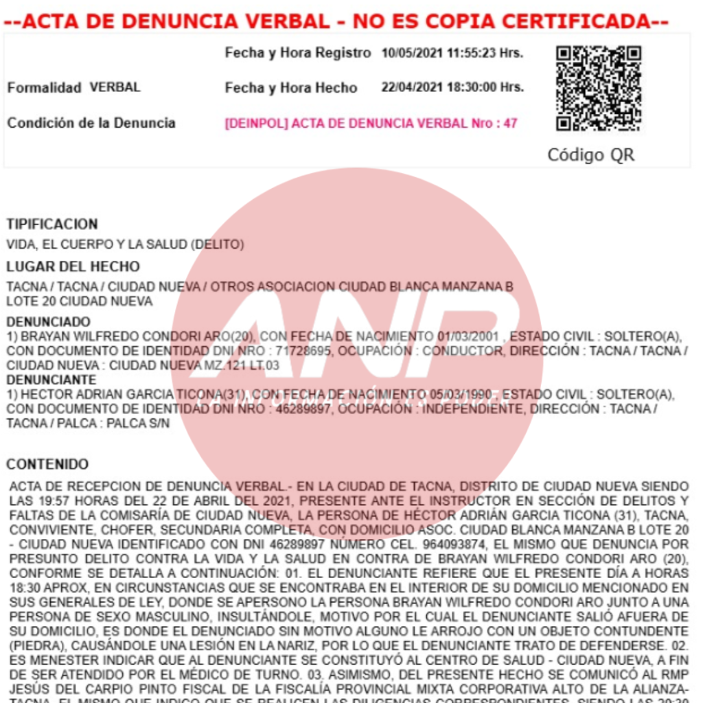 Se trata de un Acta de Intervención Policial del 13 de octubre de 2024, que consigna a Condori Aro como presunto implicado en un hecho ocurrido en Ciudad Nueva. Ese día, una ambulancia del SAMU trasladó al Hospital Hipólito Unanue a un hombre de 39 años que presentaba una herida punzo cortante en el tórax, contusión y excoriación en el cuero cabelludo. Lesiones compatibles con el uso de un arma blanca, según el diagnóstico médico preliminar.