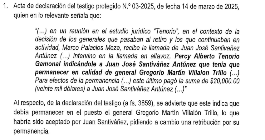 De acuerdo con la versión del testigo protegido con clave 3-2025, los hechos se remontan a diciembre de 2024, cuando se habría producido una reunión clave en la que participaron el coronel PNP (r) Percy Tenorio y Marco Palacios, exsocio y cliente de Santiváñez.