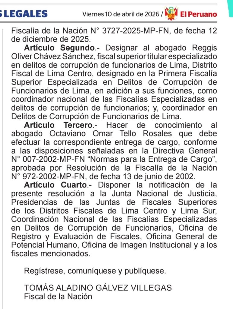 Desginación del fiscal Reggis Chávez Sánchez tiene la firma de Tomás Gálvez Villegas. Foto: El Peruano.